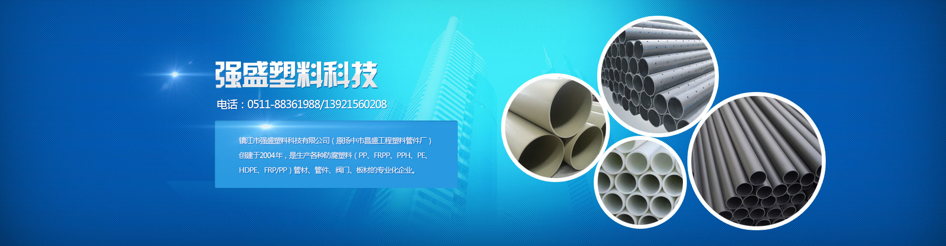 鎮(zhèn)江市強(qiáng)盛塑料科技有限公司(原揚(yáng)中市昌盛工程塑料管件廠)創(chuàng)建于2004年,是生產(chǎn)各種防腐塑料(PP、FRPP、PPH、PE、HDPE、FRP/PP)管材、管件、閥門、板材的專業(yè)化企業(yè)。公司擁有各類先進(jìn)生產(chǎn)設(shè)備,固定資產(chǎn)約3800萬元,可生產(chǎn)管材、管件口徑為Φ15-Φ1200mm,產(chǎn)品規(guī)格齊全。目前產(chǎn)品廣泛適用于醫(yī)藥、食品、冶金、造紙、電力、礦山、城市污水處理、垃圾填埋、輕工紡織等領(lǐng)域,暢銷全國各省市自治區(qū),遠(yuǎn)銷二十多個(gè)國家及地區(qū)。